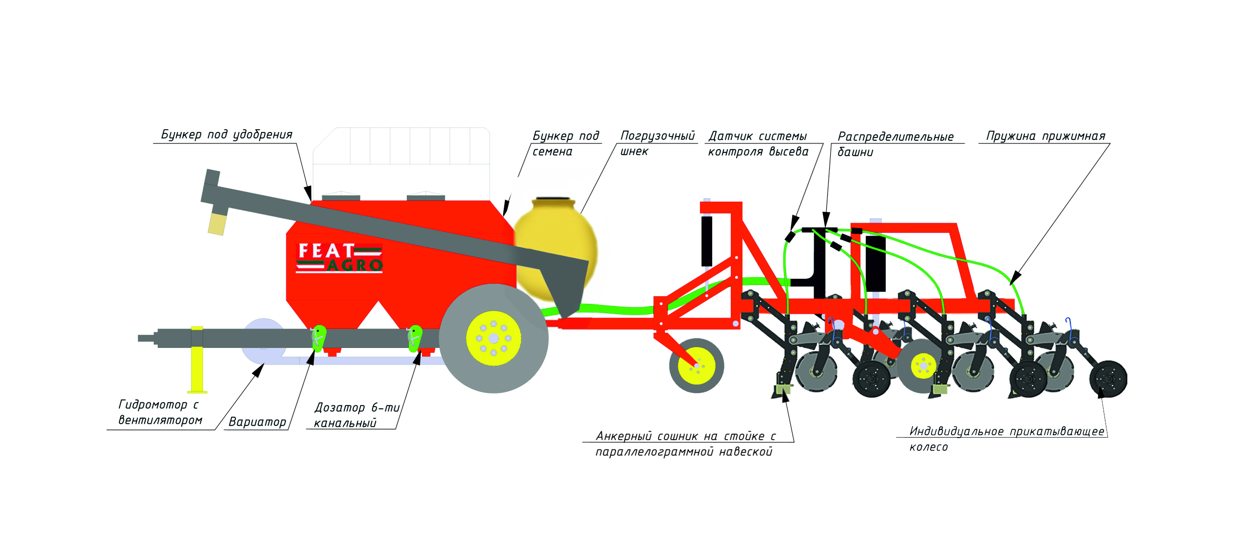 High-precision application of seeds and fertilizers is guaranteed, thanks to an independent coulter with a parallelogram attachment and two support-collecting wheels, and rolling wheels with atmospheric pressure tires allow you to work in any conditions, including in conditions of high soil humidity. The design of the stand of the sowing complex with seeding in the anchor coulter on a parallelogram also guarantees a high ability to pass crop residues. This sowing complex is designed for lowercase sowing of grain, leguminous and small-seeded crops on a processed or minimally processed background.